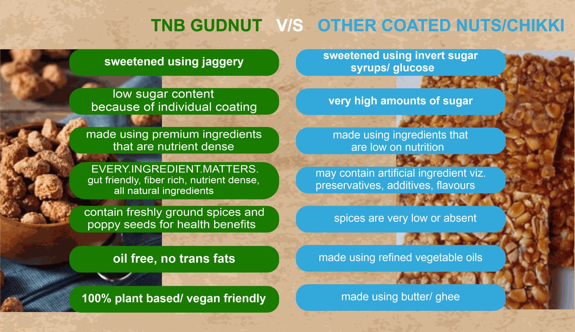 Roasted chana, peanuts and nuts coated with jaggery, poppy seeds and a hint of spices to give a crunchy, earthy, flavourful and wholesome experience – a reinvention of the classic Chikki. Made using health boosting ingredients, GudNut are gluten free, 100% plant based and incredibly delicious. Of course, no use of glucose syrup and artificial sweeteners is made in making of GudNut – truly good.