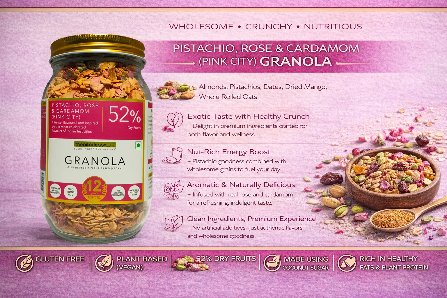 Pistachio, Rose & Cardamom (Pink City) Granola by The Nibble Box is a unique and flavorful granola inspired by the rich and aromatic ingredients of India. Crafted with whole rolled oats, pistachios, almonds, dates, and dried mango, this premium blend offers a delightful combination of nutty crunch and fragrant floral notes.
