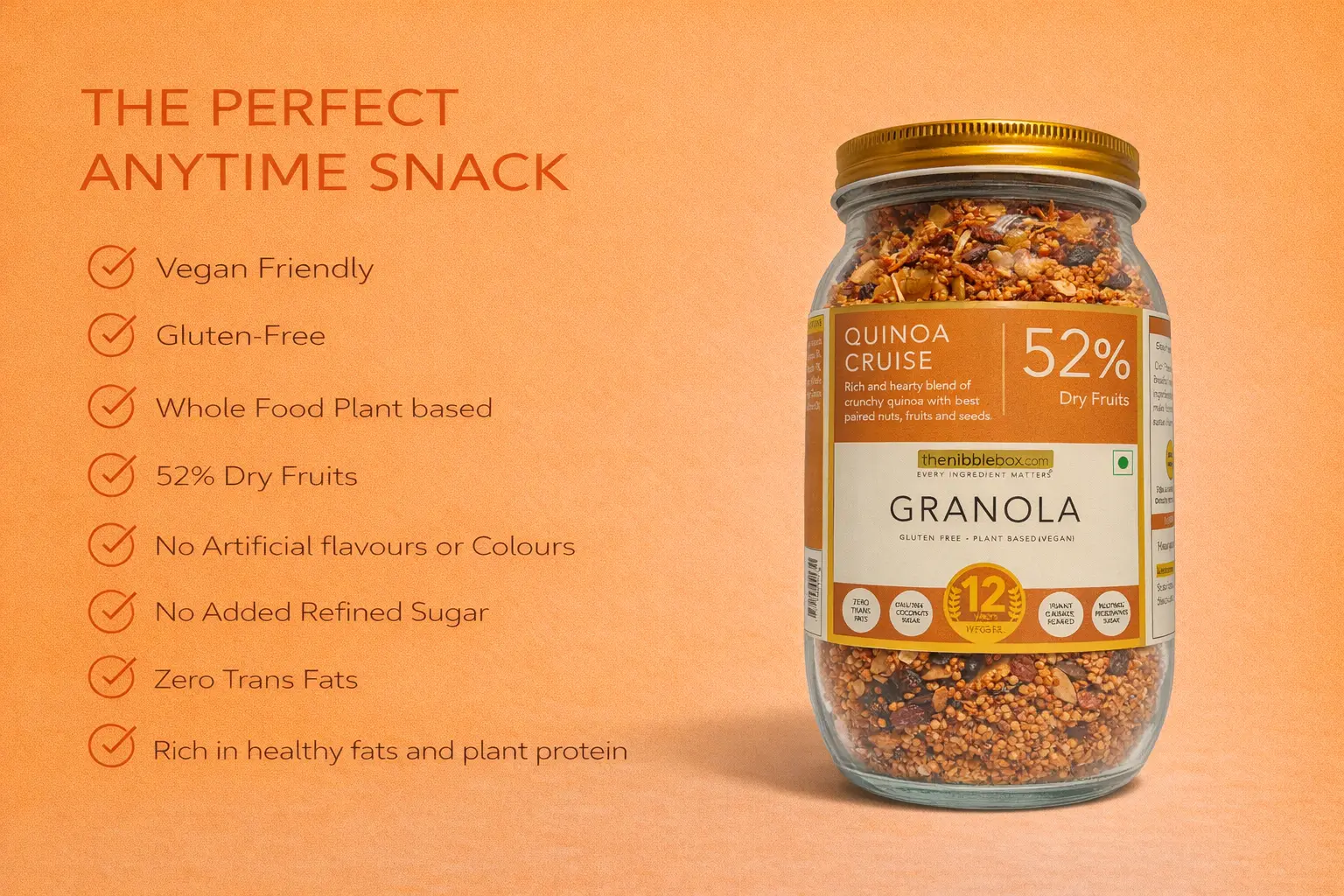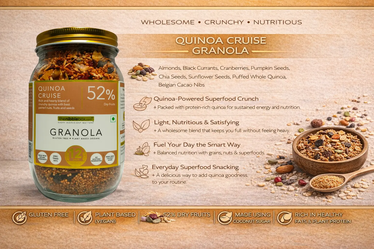 Quinoa Cruise Granola by The Nibble Box is a wholesome and nutrient-rich granola powered by the goodness of puffed whole quinoa, nuts, seeds, and dried fruits. Crafted with almonds, cranberries, black currants, pumpkin seeds, chia seeds, sunflower seeds, and Belgian cacao nibs, this delicious blend delivers a perfect balance of crunch, flavor, and superfood nutrition.