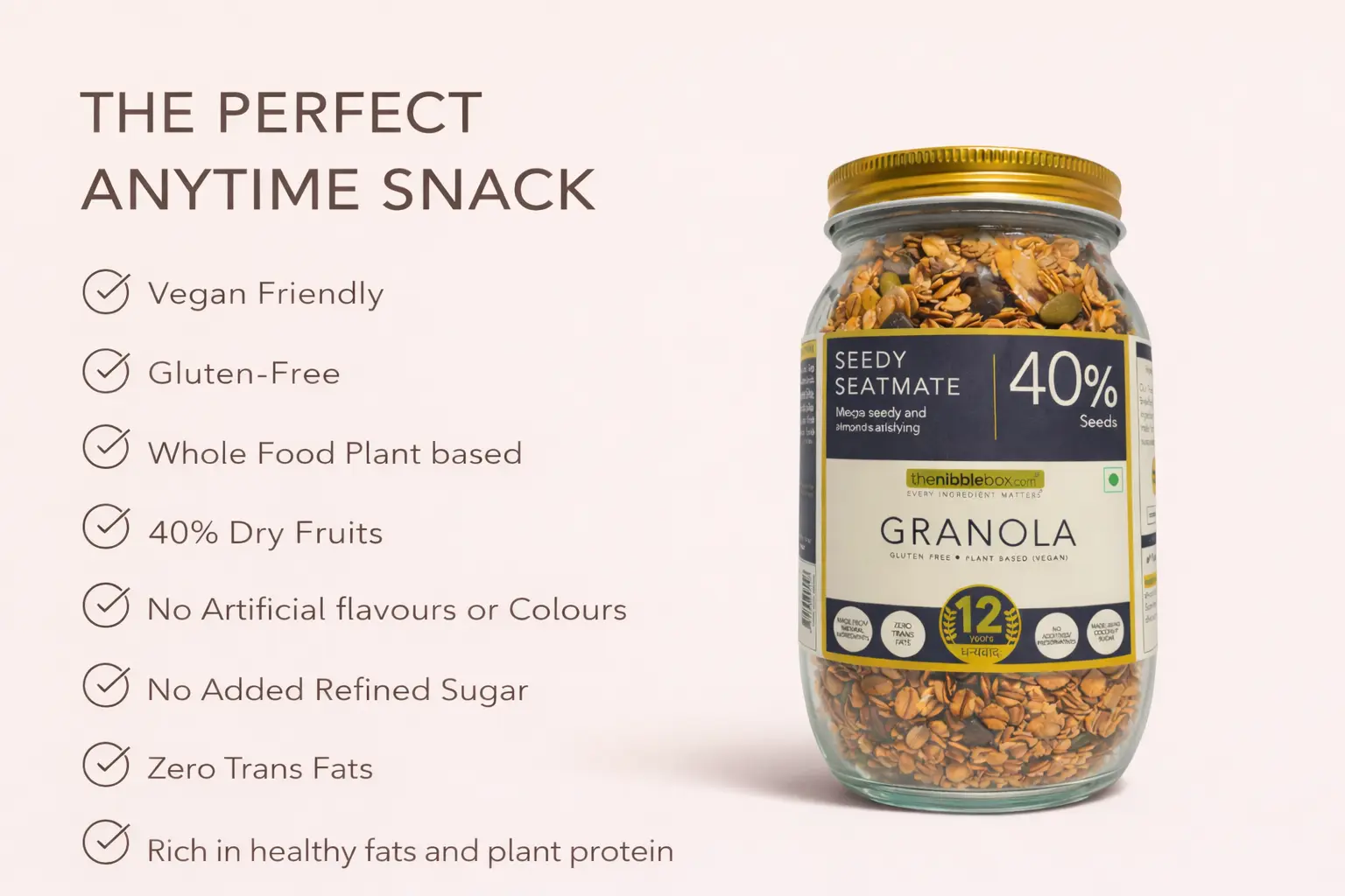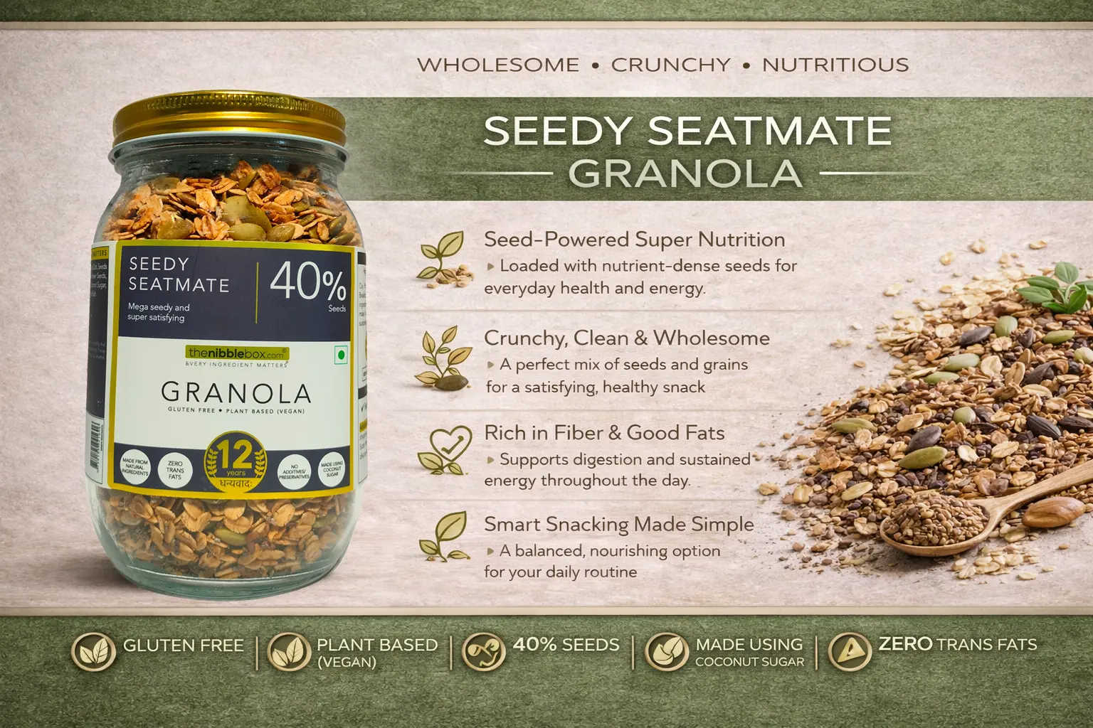 Seedy Seatmate Granola by The Nibble Box is a wholesome, crunchy, and nutrient-dense granola crafted with a powerful blend of premium seeds and whole grains. Packed with 40% nutrient-rich seeds, this granola delivers a perfect balance of taste, texture, and everyday nutrition.